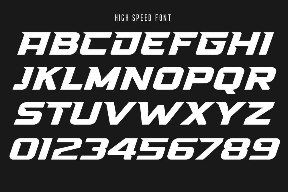 High Speed font is a bold italic font inspired by extreme sports. It's a hard-working font that is perfect for reinforcing your project with a no-nonsense display typeface. High Speed fits a variety of uses where a rugged typeface is needed. From bus wraps to book covers, posters to packaging, It's a great choice when you need to add some hard-working grit and a ‘roll up your sleeves’ attitude to your project.