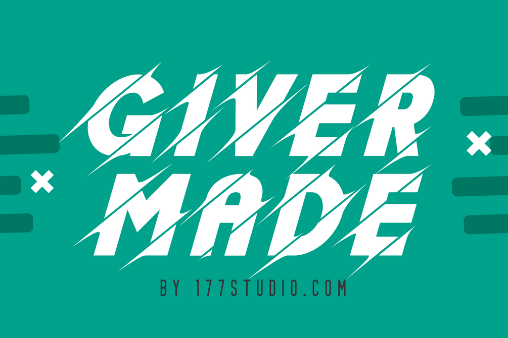 Giver Made Font is a futuristic and bold sport font, this font displays speed, angle, and showmanship. This is a font that was made to impress on something strong, sharp yet dynamic. Ideal for; Logos, printed quotes, invitations, image overlays, greeting cards, product packaging, text headers, & whatever else your imagination holds!