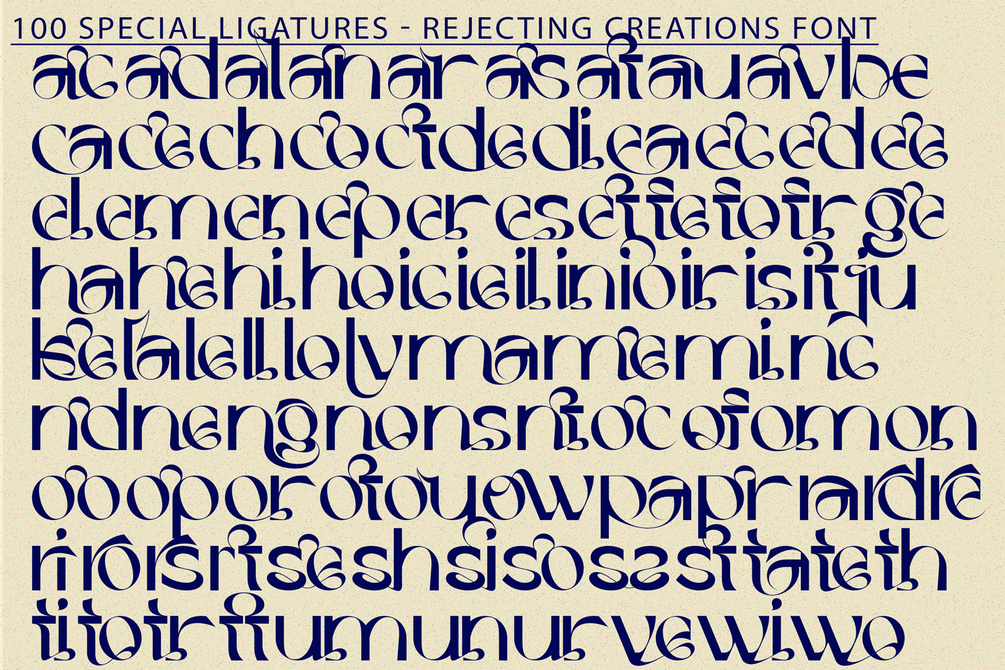 Rejecting Creations - Ligature Font is a highly stylized experimental serif typeface crafted for bold visual storytelling. With sharp contrasts, unusual ligature compositions, and abstract ornamental terminals, this font was designed to push the boundaries of traditional typography. Its avant-garde forms blend elegance with surprise, offering a sense of rhythm and movement through unexpected curves and architectural cuts. Perfect for editorial headlines, branding identities, album covers, posters, and artistic layouts that require a statement piece.