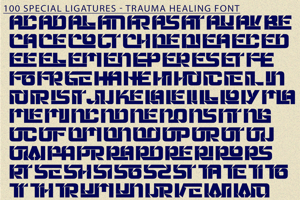 TRAUMA HEALING - FUTURISTIC FONT is a bold futuristic display sans serif typeface inspired by industrial design, sci-fi aesthetics, and high-impact technology branding. Built with strong geometric shapes, sharp cuts, and powerful block forms, this font delivers a confident and aggressive visual presence. Featuring both Uppercase and Lowercase letters, approximately 100 custom special ligatures, complete Numerals & Punctuation, and extensive Accented characters, TRAUMA HEALING allows designers to create striking headlines, logos, and typographic compositions. Its angular details, solid structure, and technical ligature system make it perfect for gaming, eSports, sci-fi posters, technology branding, AI projects, and futuristic visual identities.
