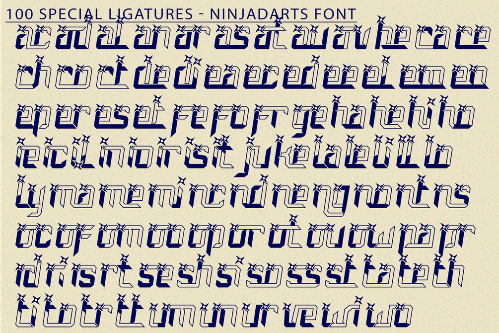 Ninjadarts - Shuriken Font is a cutting-edge display typeface inspired by ninja aesthetics and shuriken weaponry. Designed with sharp angles, geometric cuts, and dynamic energy, this font brings a sense of stealth, action, and futuristic attitude to your typography. Every character is infused with ninja flair, featuring blade-like edges and shuriken elements that pierce through the forms—perfect for projects that demand bold impact, such as game titles, tech branding, martial arts posters, or cyberpunk visuals.