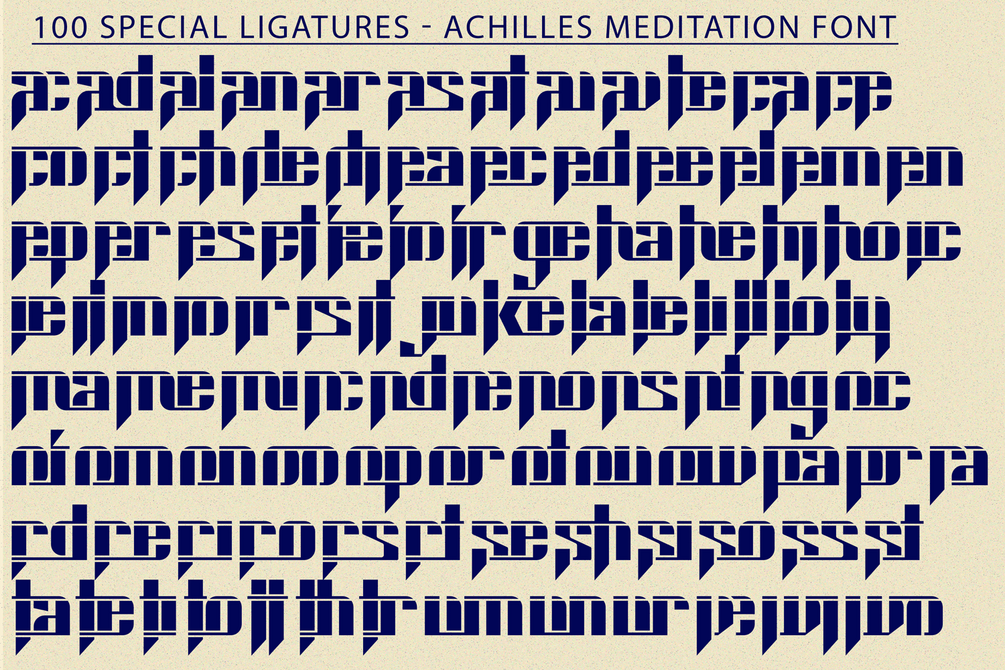 Achilles Meditation was built with OpenType features and includes 100 ligatures, alternate, numbers, punctuation, and it also supports other languages.