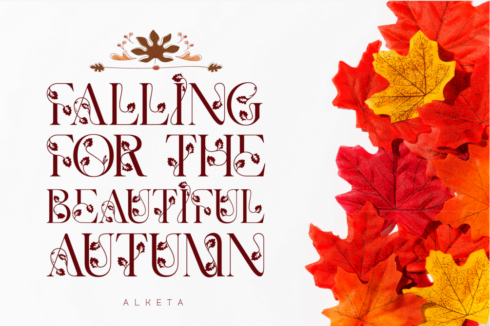 alketa nature font - a delicate floral font with flowers and leaves, that features a nature concept with leaf swashes. It's an elegant and feminine font suitable for all kinds of headlines and decorative purpouses. It features a unique style and will add a friendly feel to your upcoming projects. Get inspired by its authentic feel and use it to create beautiful poster, product packaging or logo and many more!