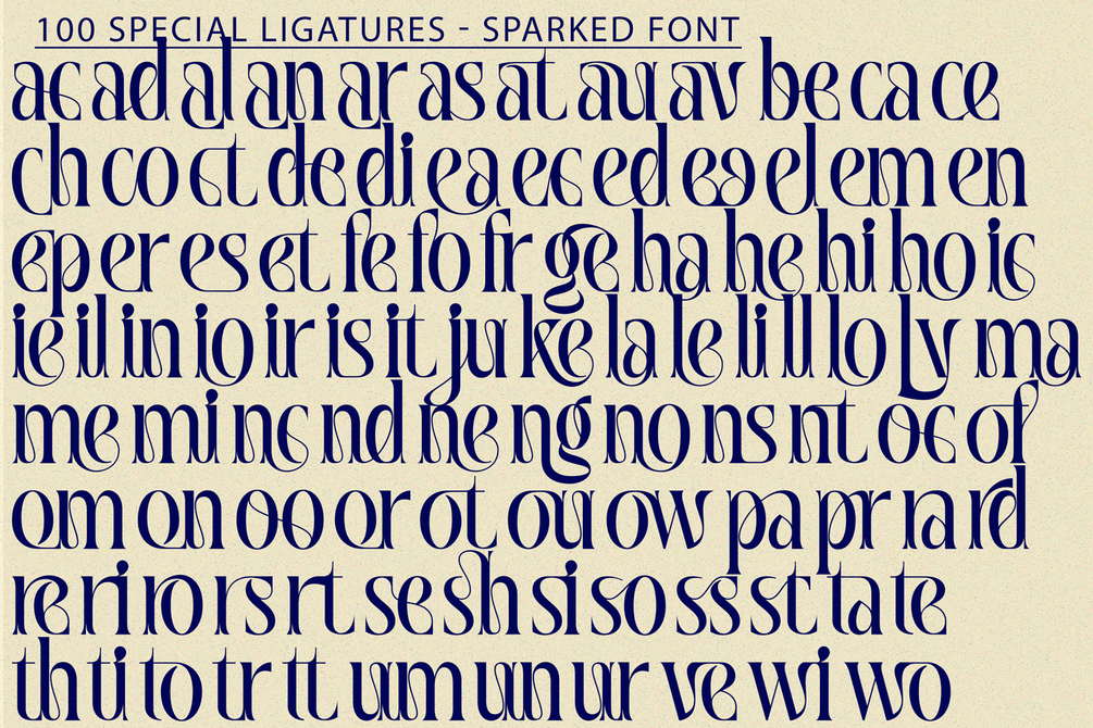 This font includes uppercase and lowercase letters, along with an extensive set of 100 special ligatures, numerals, punctuation, and accented characters—ensuring versatile usage across various languages and creative compositions. Whether you're crafting a luxurious logo, an elegant wedding invitation, or a striking magazine headline, Sparked delivers a refined and distinctive typographic experience.