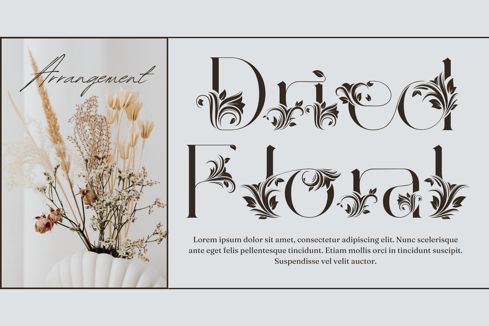 Each letter is adorned with beautifully crafted floral elements, giving your text a romantic and artistic flair. The detailed serifs and swirling embellishments evoke a sense of grandeur, sophistication, and classic beauty.