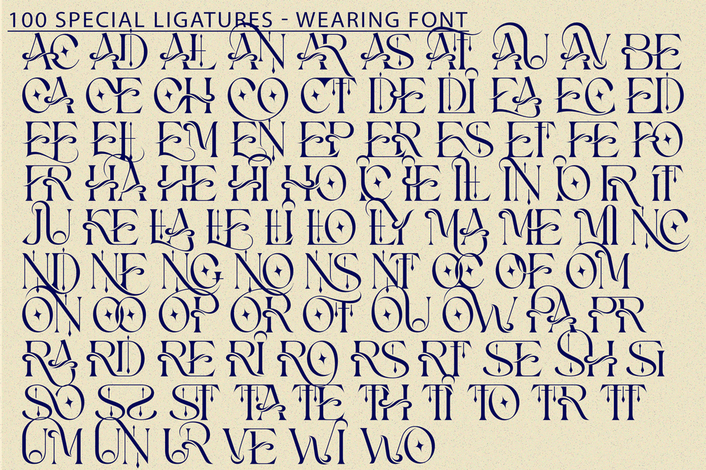 Wearing Font – An Elegant Modern Serif Display Font, a sophisticated modern serif display font that blends timeless elegance with a contemporary flair. Designed to captivate, this typeface features beautifully crafted uppercase and lowercase letters, complemented by over 100 unique ligatures and stylistic alternates that bring artistry and charm to every word.
