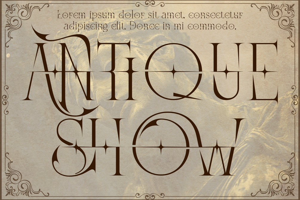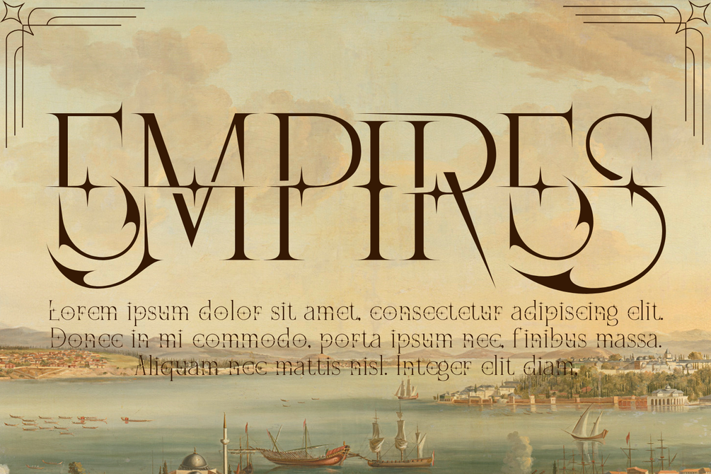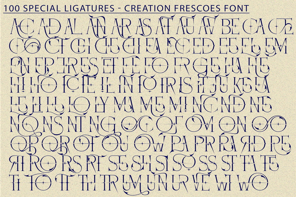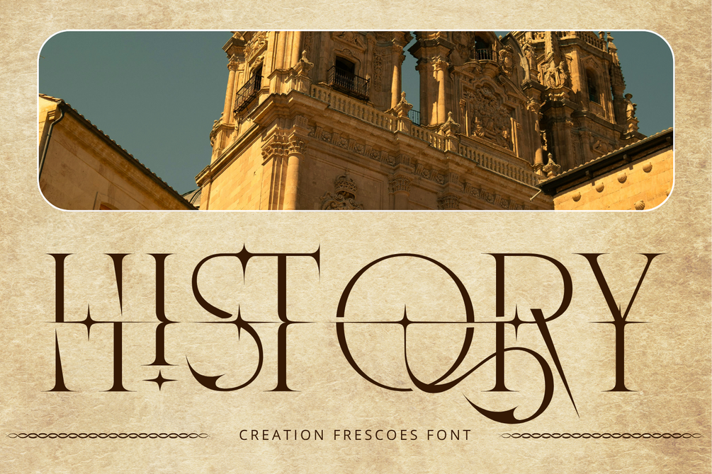 CREATION FRESCOES - LUXURY SERIF FONT, a luxurious Decorative Serif Display Font inspired by Renaissance artistry and Gothic aesthetics. Its elegant balance of sharp serifs and flowing curves creates a timeless visual experience — perfect for designers who want to express sophistication and artistic flair. This font combines ornamental beauty with strong structure, making it ideal for logos, editorial titles, posters, or any design seeking a vintage yet refined atmosphere.