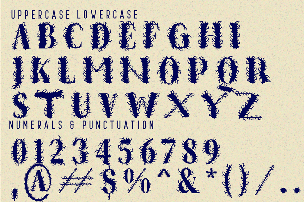 Aquarius Thorny Font is a haunting thorn-covered display font designed to evoke an atmosphere of tension, decay, and primal wildness. Each character is entangled with razor-sharp barbs and creeping vines, creating a visceral sense of fear and fascination. Perfect for horror branding, metal band logos, fantasy titles, gothic posters, or anything that needs a sharp and dramatic edge — Aquarius Thorny doesn’t whisper, it screams.