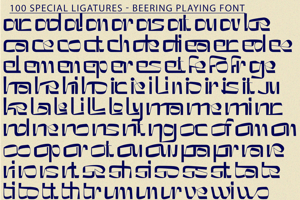 Beering Playing Font. This font has unique and bold letterform, make it great to be used for modern and minimalistic design theme. A large selection of interwoven Opentype ligatures, means ample selection and variety in your finished look. This is primarily a display font (but can also be used for body copy) that we recommend using in the following types of work; magazines (titles and layouts), logos and branding, invitations, quotes, blog headers, posters, and advertising.