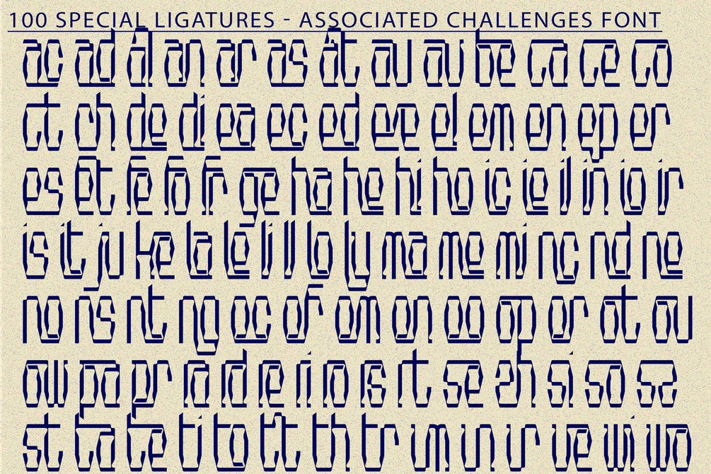 Associated Challenges Font is an industrial modular display sans serif typeface inspired by mechanical structures and engineered forms. Built from bold geometric components and solid block shapes, this font delivers a strong, technical, and industrial visual identity. Featuring both Uppercase and Lowercase letters, approximately 100 custom special ligatures, complete Numerals & Punctuation, and extensive Accented characters, Associated Challenges enables designers to create powerful, structured, and high-impact typographic compositions. Its modular construction, mechanical details, and bold proportions make it perfect for industrial branding, technology projects, posters, gaming, robotics themes, and futuristic design concepts.