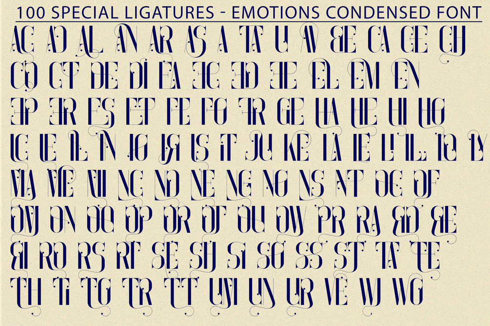 Emotions Condensed was built with OpenType features and includes 100 ligatures, alternate, numbers, punctuation, and it also supports other languages.