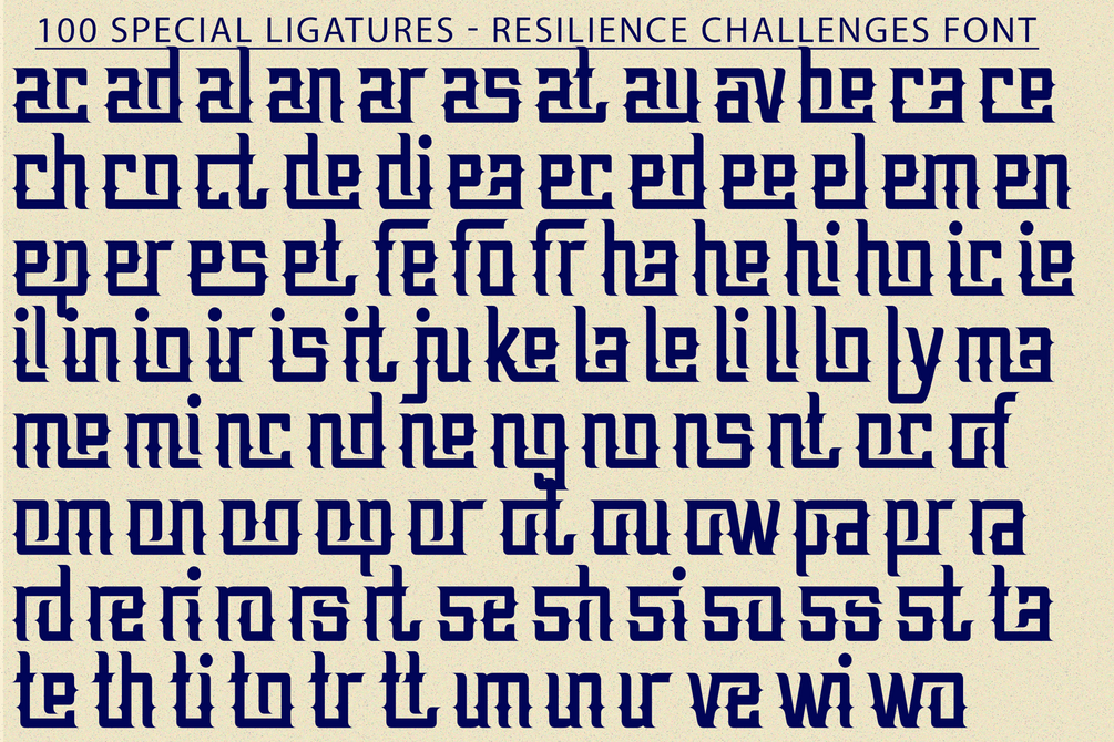 Resilience Challenges was built with OpenType features and includes 100 ligatures, alternate, numbers, punctuation, and it also supports other languages.