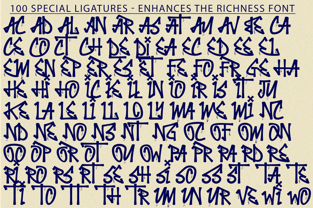 Enhances the Richness Font, inspired by the graffiti tags found in urban street art. Designed with dynamic freestyle flair, it brings the spirit of graffiti to your creative ideas. This style often used by several graffiti artist around the world because the style is very unique, very fun to write in markers. Perfect if you want realistic Street art style or hip hop for your designs, poster, props etc.