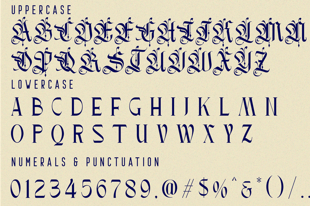 Asember Modern - Hybrid Font is a gorgeous and luxury mix of classic blackletter and modern serif fonts. All Uppercase letters have a blackletter style and may by insert anywhere in the word to create unique logo, name or display title. Just type them via Uppercase. The font combines elements of both modern serif and blackletter styles, creating a striking and distinctive appearance. It’s a font that combines blackletter style with serif font. It is suitable for vintage, metal, tattoo, and modern designs because it blends traditional and modern elements.