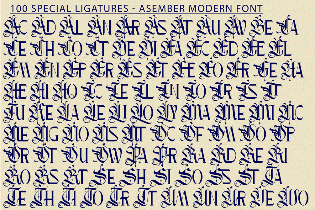 Asember Modern was built with OpenType features and includes 100 ligatures, alternate, numbers, punctuation, and it also supports other languages.