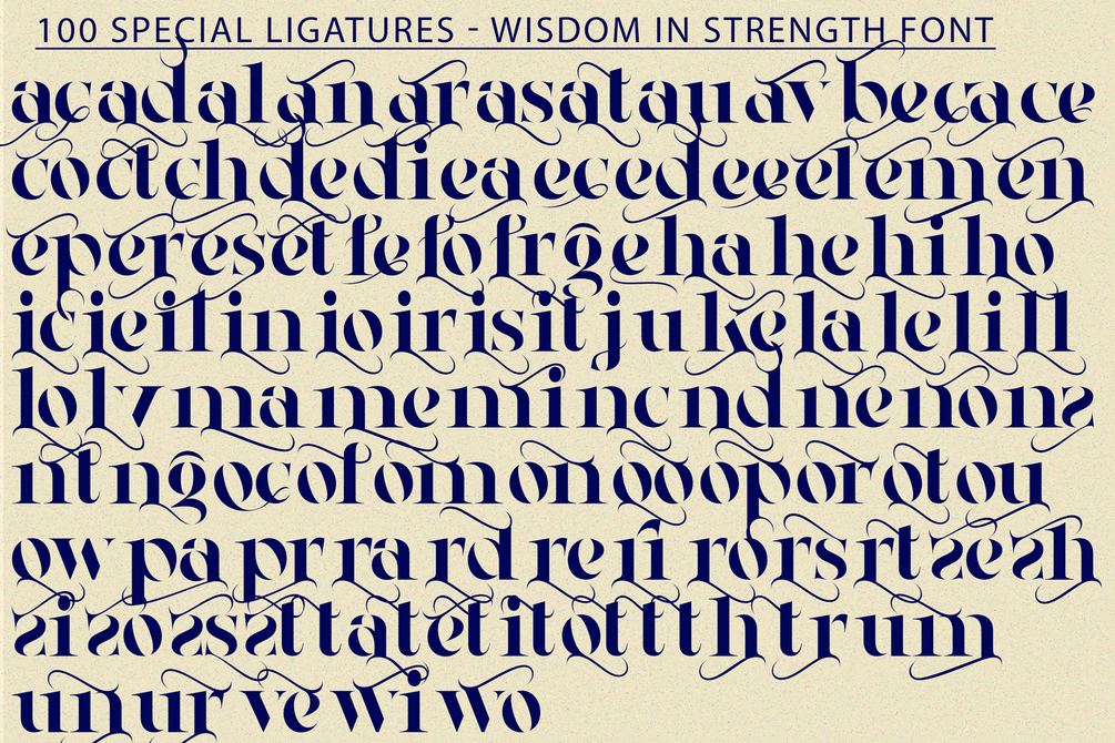 Wisdom in Strength was built with OpenType features and includes 100 ligatures, alternate, numbers, punctuation, and it also supports other languages.