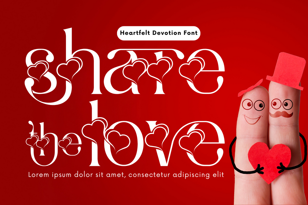 Heartfelt Devotion - Romantic Font is a charming and romantic serif display font crafted to capture the warmth of affection and heartfelt expression. With its unique heart-infused terminals and whimsical curves, this typeface is designed to bring elegance, sweetness, and personality to any design. Perfect for wedding invitations, Valentine’s Day designs, quotes, packaging, and editorial titles, Heartfelt Devotion delivers a visual poetry that speaks directly to the heart. Each glyph is delicately styled to blend classical serif sophistication with playful ornamental detailing.