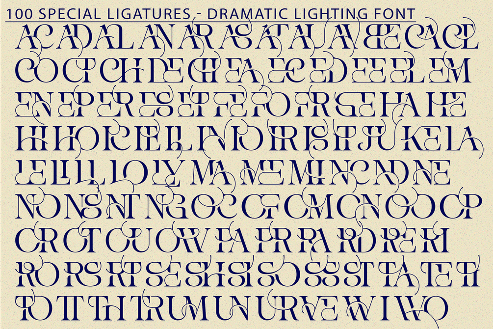 DRAMATIC LIGHTING FONT – A Dramatic Experimental Serif Display, a bold serif display font that merges classic elegance with a daring modern twist. Featuring sharp contrasts, experimental ligatures, and striking elongated curves, this font creates a dramatic and unforgettable visual impact. Perfectly crafted for editorial headlines, luxury branding, fashion campaigns, poster design, and high-end packaging, DRAMATIC LIGHTING balances sophistication with avant-garde creativity. Each character feels both structured and free-flowing, making it a versatile choice for designers who want to make a statement.