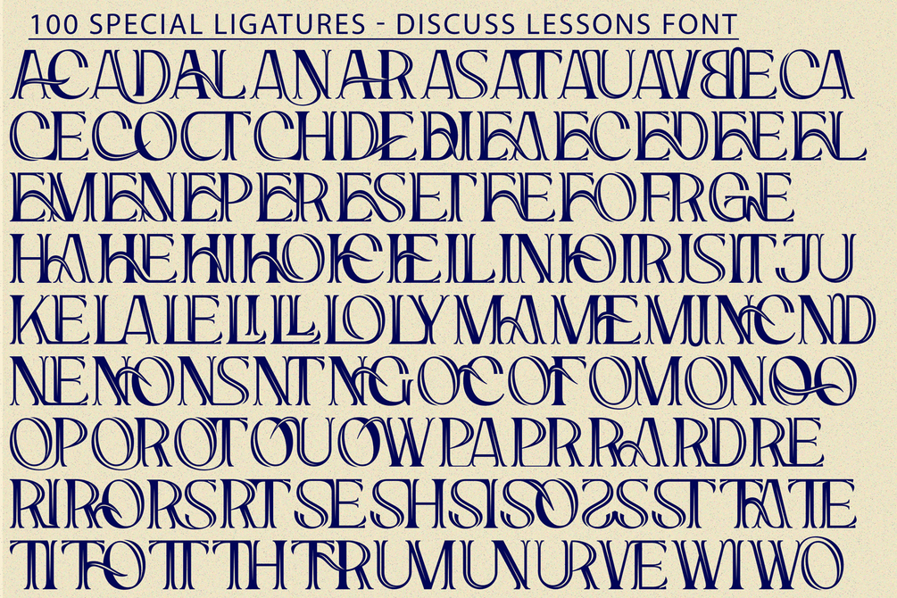 Discuss Lessons was built with OpenType features and includes 100 ligatures, alternate, numbers, punctuation, and it also supports other languages.