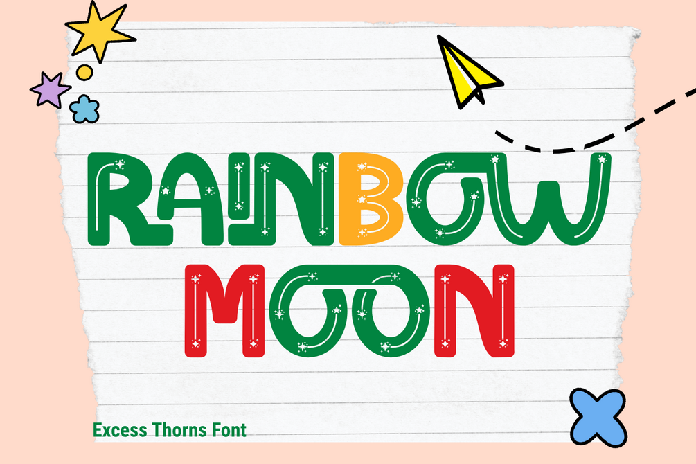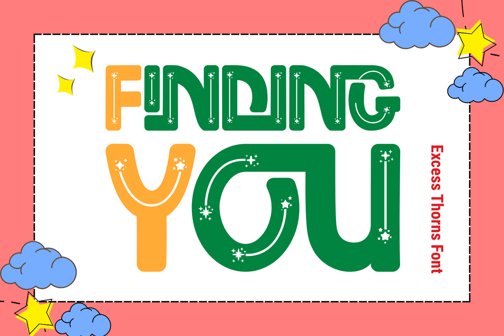 Excess Thorns - Playful Font – Cosmic Bubble Display Font, dreamy display typeface inspired by retro-futuristic design and cosmic aesthetics. With its soft curves, bubbly proportions, and magical star-studded inner strokes, this font is designed to bring wonder and joy to your creative work. Whether you're designing a book cover, fashion label, children's product, or a whimsical poster, Excess Thorns adds charm, uniqueness, and a sprinkle of stardust to every letter.