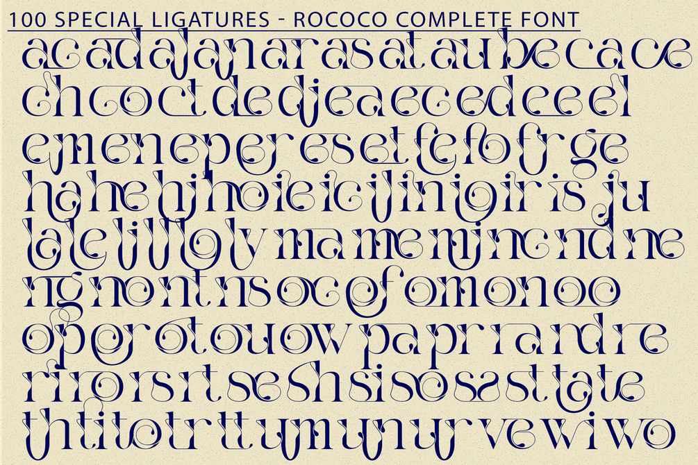 Rococo Complete - Ligature Serif Font - An Elegant Modern Ligature Serif Font, a sophisticated Modern Serif font meticulously crafted with a stunning array of decorative ligatures. Inspired by ornate elegance, this font features high-contrast strokes and graceful curves, but its true magic lies in the intricate connections and flourishes that flow between letters.