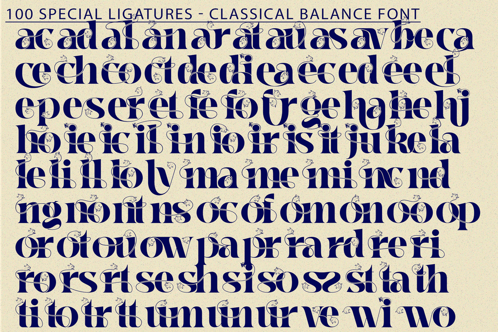 Classical Balance - Decorative Font is a high-contrast serif display font infused with botanical elegance and neoclassical finesse. Each letterform is gracefully adorned with flourishing vines, floral ornaments, and curving tendrils, creating an exquisite blend of nature and structure.