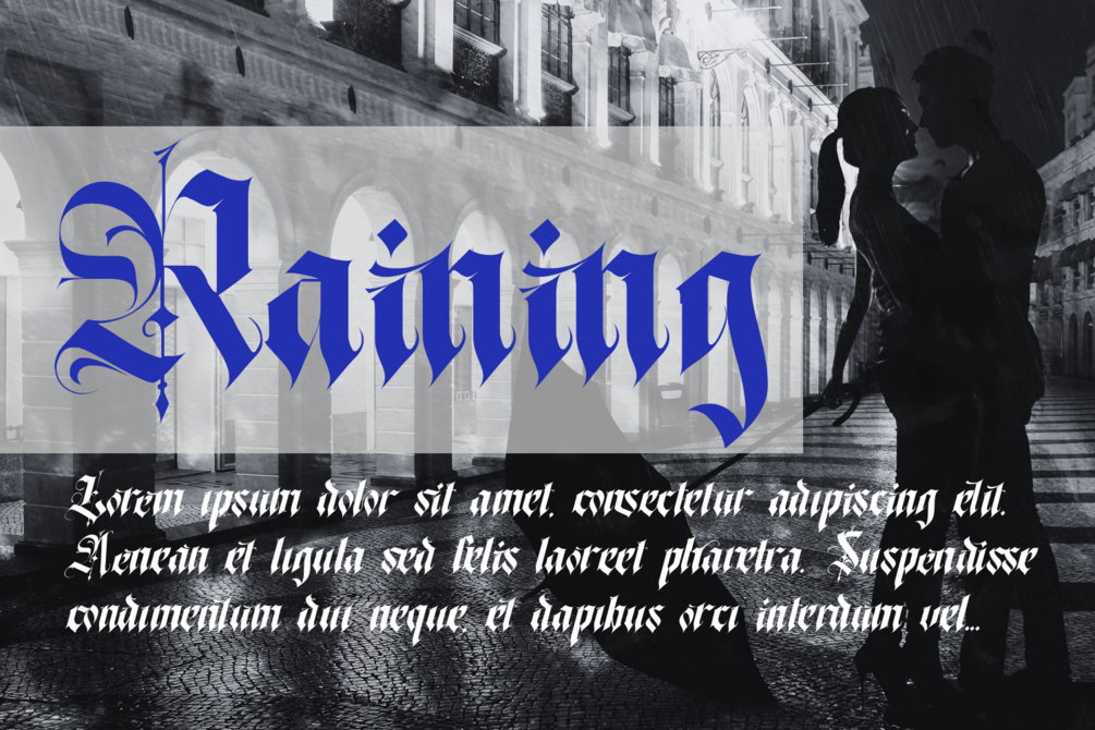 Traditional Preparation Font is inspired by cool old style blackletter letters. This typeface has many ligature and a choice of several characters from uppercase or lowercase letters. A gothic display font a distinct, highly detailed, and chic Blackletter font. It would make a great choice for exquisite retro-urban designs, tattoo business branding, logos, vintage designs, movie, poster, apparel, illustration, and more.