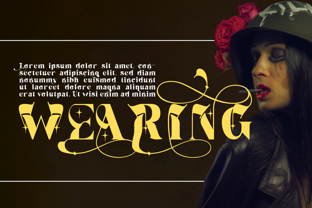 PERSONAL FRESCOES FONT - A Luxurious Baroque Blackletter Font, a decorative blackletter display font infused with baroque opulence and modern gothic energy. Each letter is boldly structured with sharp blackletter forms, while elegant flourishes, swashes, and sparkling star-like details add a touch of drama and refinement. This font exudes power and artistry, making it perfect for luxury branding, gothic-inspired posters, music covers, tattoo designs, editorial layouts, and any project that demands a sense of grandeur and mystique.
