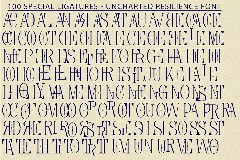 Uncharted Resilience was built with OpenType features and includes 100 ligatures, alternate, numbers, punctuation, and it also supports other languages.