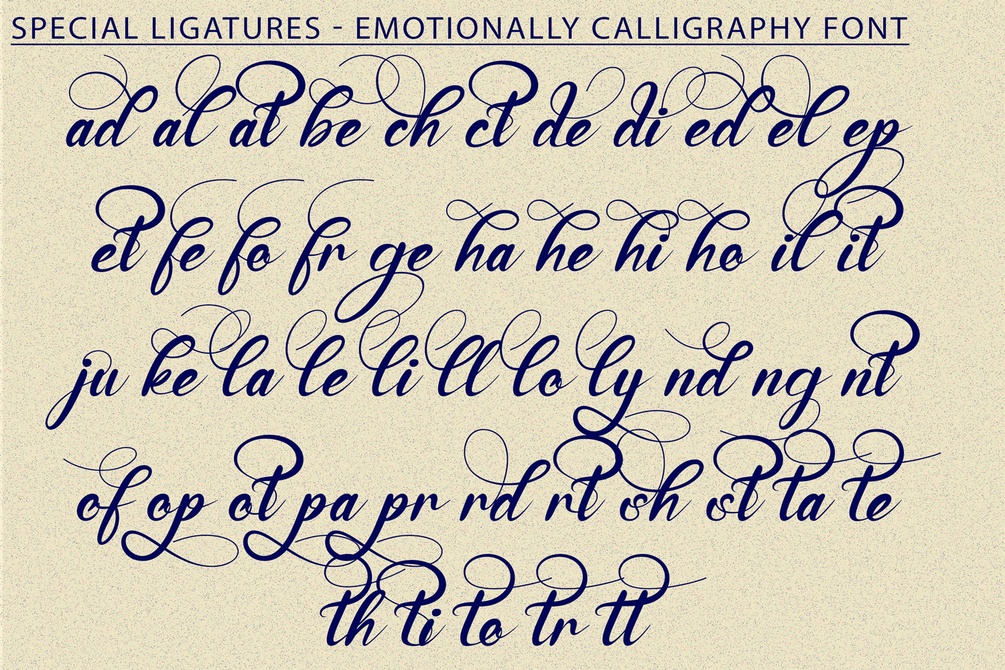 Emotionally Calligraphy Font, a modern calligraphy script font crafted with graceful curves and expressive strokes. This font captures the elegance of handwritten artistry, blending sophistication with warmth to elevate your creative projects. Each letter flows naturally into the next, creating stunning visual harmony that works beautifully across both digital and print designs.
